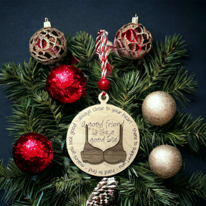 Celebrate friendship with this charming wooden ornament, crafted from quality maple and walnut. Engraved with the playful message, “A good friend is like a good bra: always close to your heart, there to support you, hard to find, and makes you look good!” This ornament is perfect for bringing a smile to your loved one’s face and adding a touch of humor to your holiday decor. A thoughtful gift that’s both meaningful and lighthearted, it’s ideal for best friends or anyone who holds a special place in your heart.