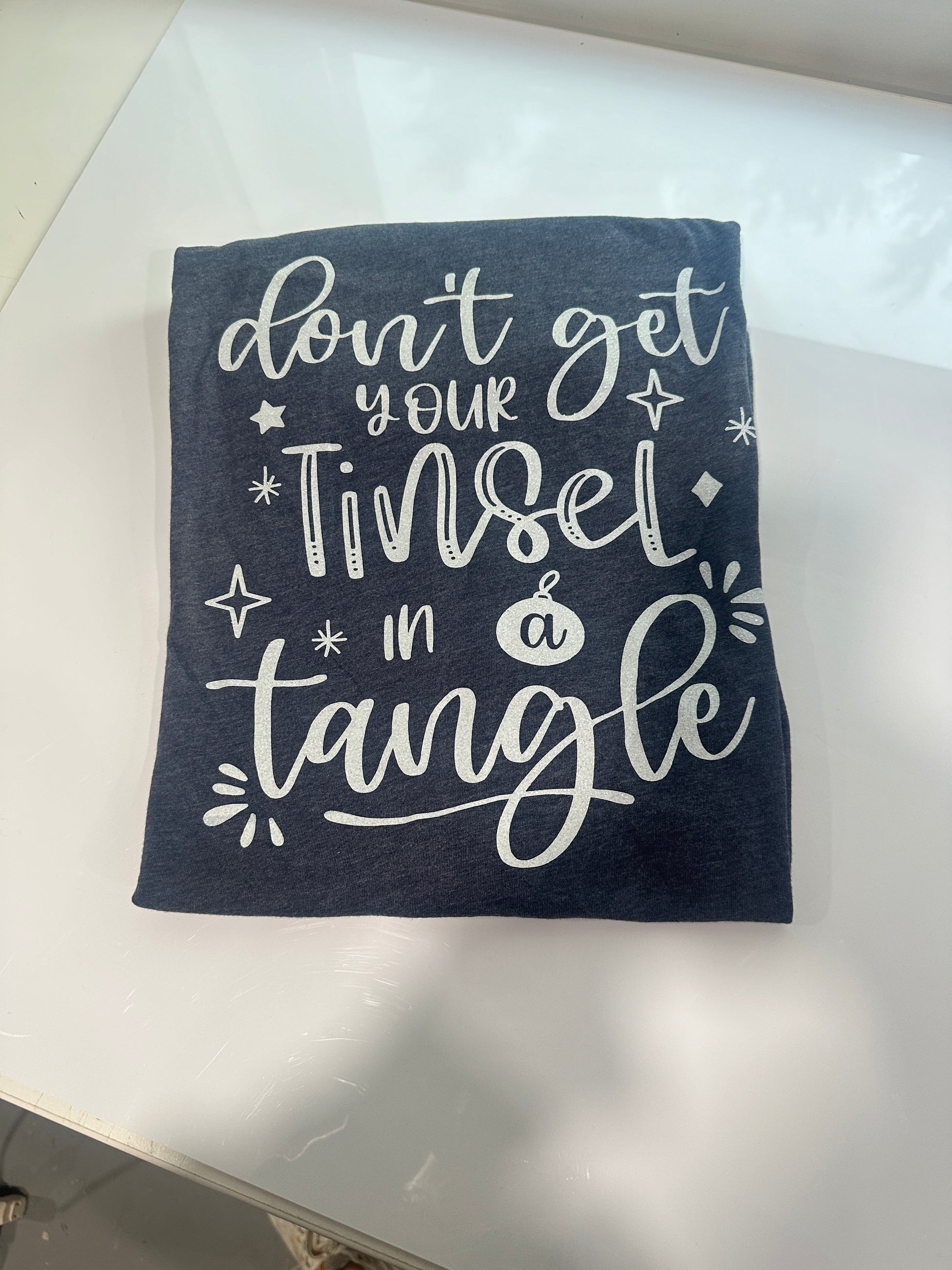 Design 2: "Don't Get Your Tinsel In A Tangle"- Light-hearted and fun, this shirt serves as a cheerful reminder to keep the holiday stress at bay and enjoy the season.