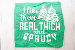 Design 1: "I Like Them Real Thick and Sprucey" - A playful twist on tree shopping, this design highlights your love for big, beautiful Christmas trees with a touch of wit.