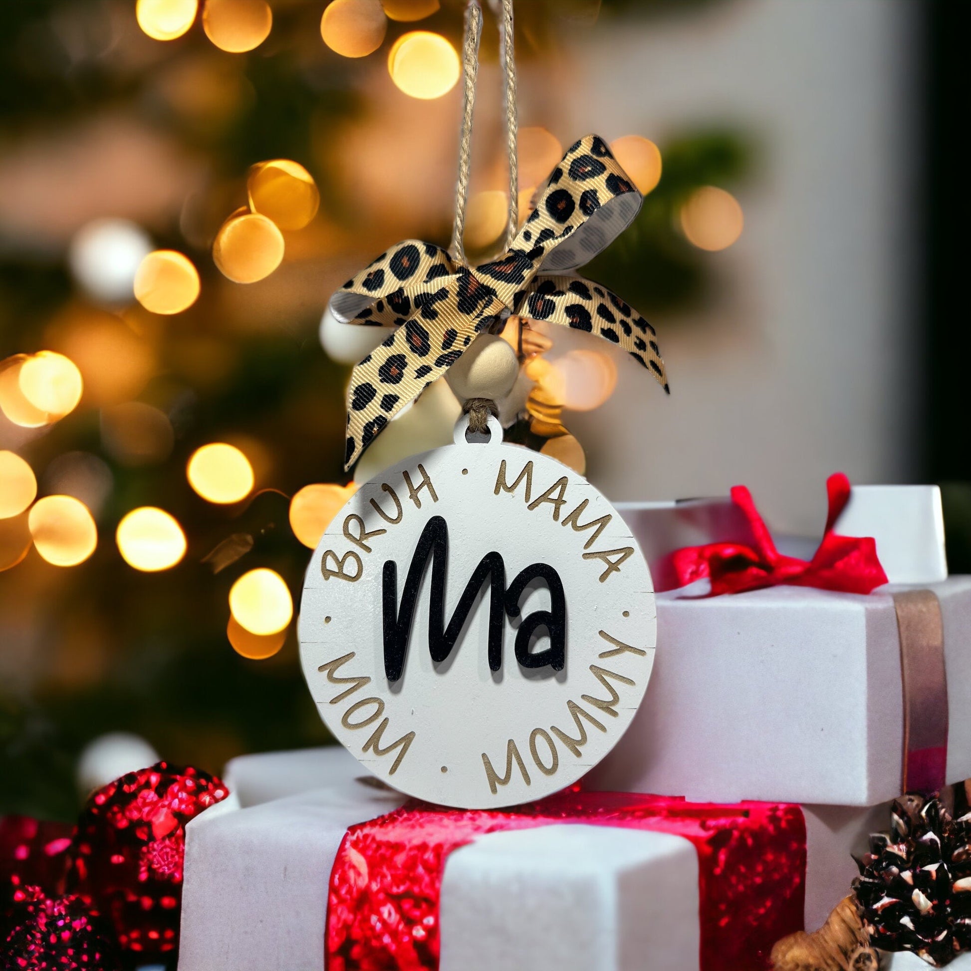 Celebrate the journey of motherhood with this charming “Bruh, Mama, Mommy, Mom” ornament, capturing each phase of a mother’s title evolution! Crafted from durable wood, this ornament features a bold “Ma” in the center surrounded by the titles that moms hear through the years. Embellished with a stylish leopard-print bow and beaded accents, it’s perfect for adding a playful touch to your Christmas tree. An ideal gift for moms who appreciate a bit of humor, this ornament brings warmth, love, and laughter to the holiday season.