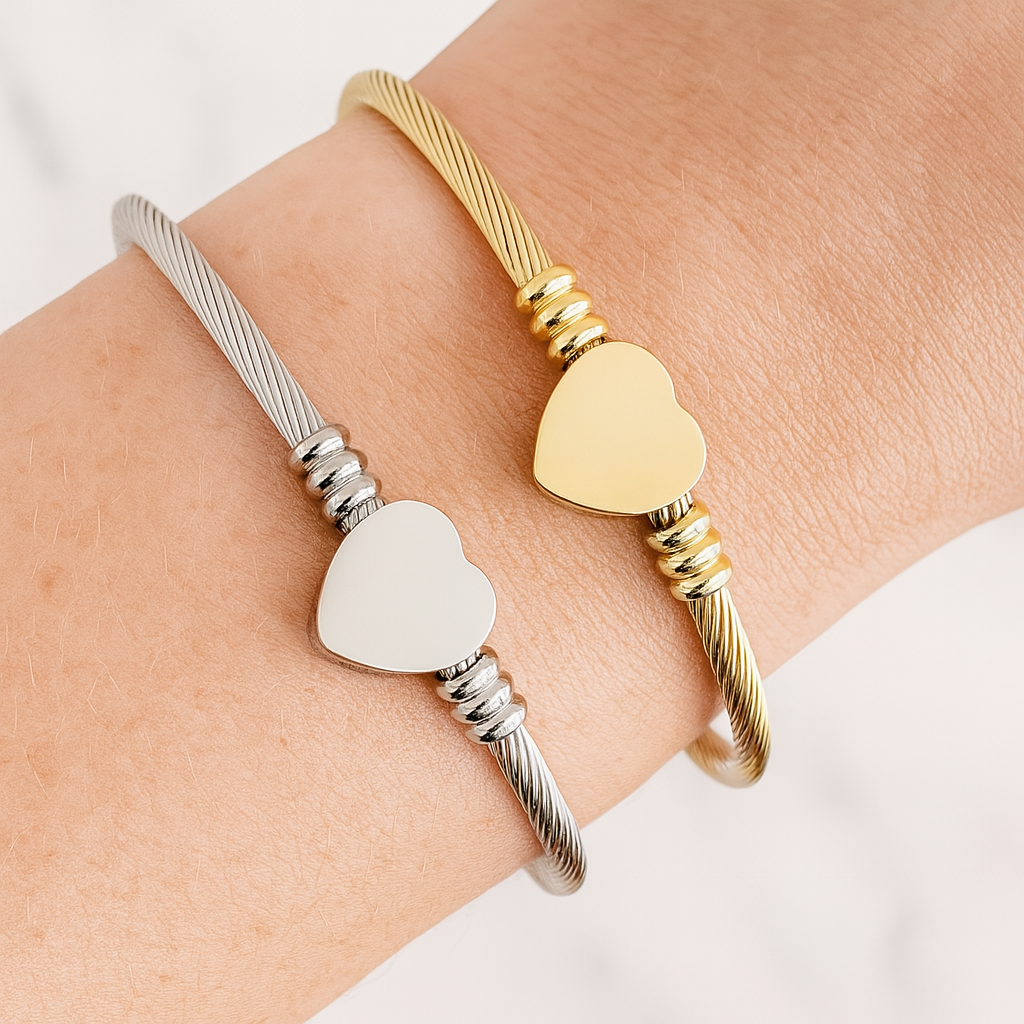 Add timeless charm and a hint of edge to your stack with our Cable Heart Bangle Bracelet. Designed with a sleek cable-style band and finished with a polished heart centerpiece, this bracelet blends modern minimalism with everyday elegance.
