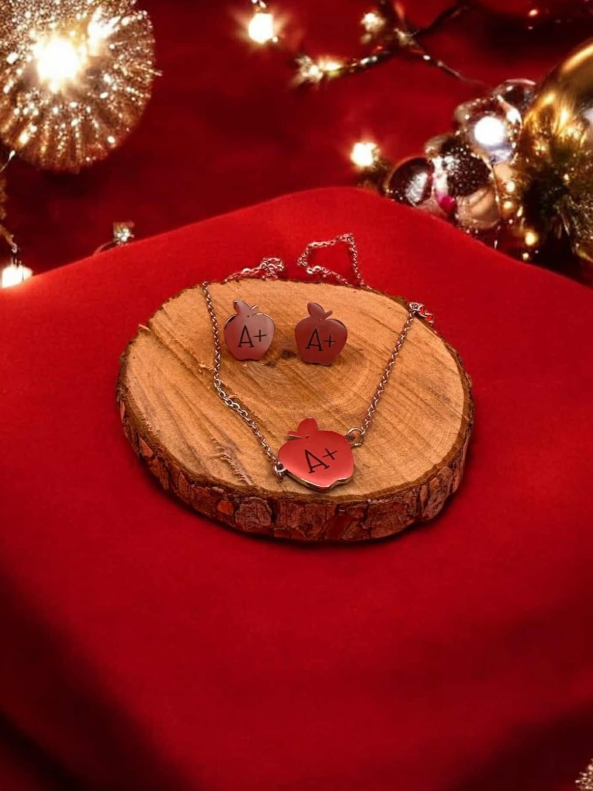 Show your appreciation for an amazing teacher with this charming apple-themed jewelry collection, perfect as a thoughtful gift for any occasion. Choose between the elegant apple necklace, the matching stud earrings, or bundle them as a set for the ultimate expression of appreciation.