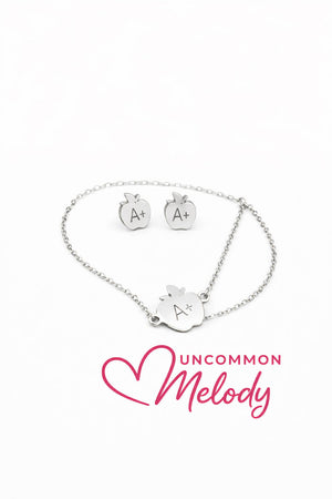 Available in gold or stainless steel colors, each piece can be customized with a meaningful touch, such as the teacher's name, teacher's initials, or "A+", making it a thoughtful and unique gift they'll cherish forever. The necklace features a dainty chain with an apple-shaped pendant, while the earrings add a subtle yet meaningful accent.
