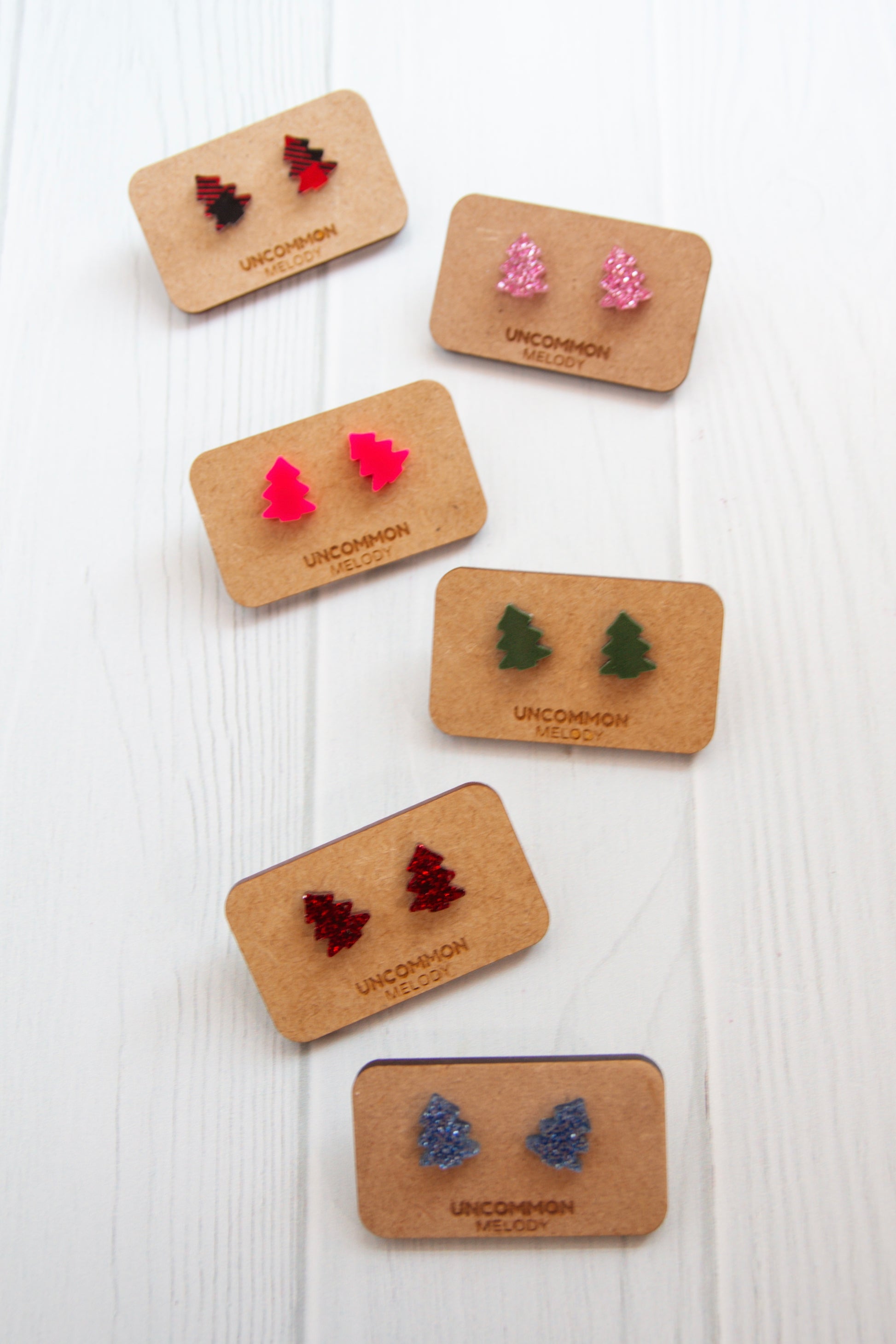 These cheerful and vibrant acrylic Christmas tree studs come in a variety of colors, adding a fun and festive touch to your holiday attire. Available in hues like red glitter, pink, green, blue and more, each pair is crafted with precision to bring a playful holiday spirit to any outfit. These lightweight earrings are comfortable for daily wear, making them the perfect accessory for the holiday season or winter celebrations. Each pair is mounted on a sturdy card, ready for gifting or personal wear. Celebrate the joy of the season in style!