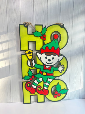 Festive Elf ‘Ho Ho Ho’ Hanging Sign – Holiday Décor