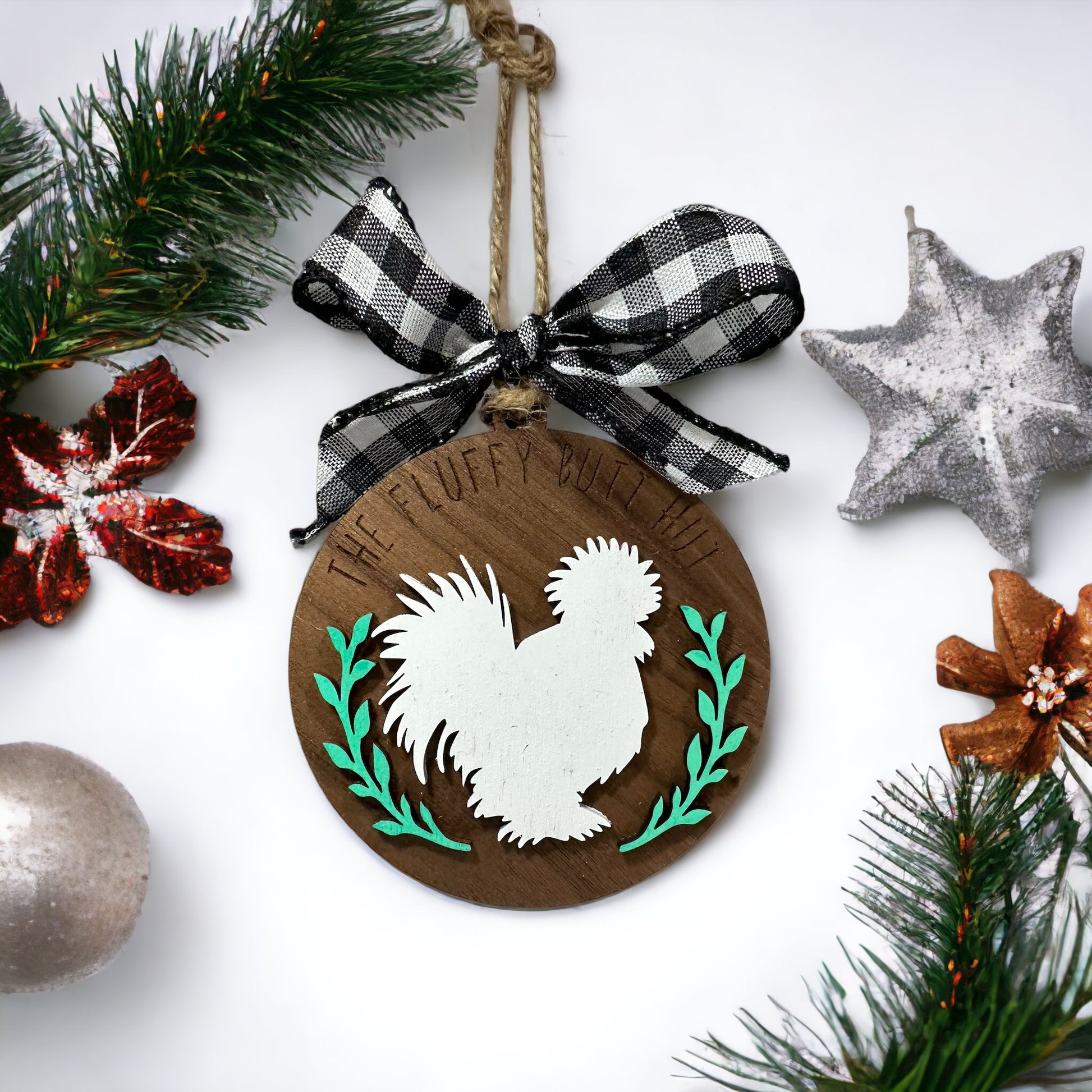 “The Fluffy Butt Hut” Chicken Ornament – Farmhouse Style Christmas Decor