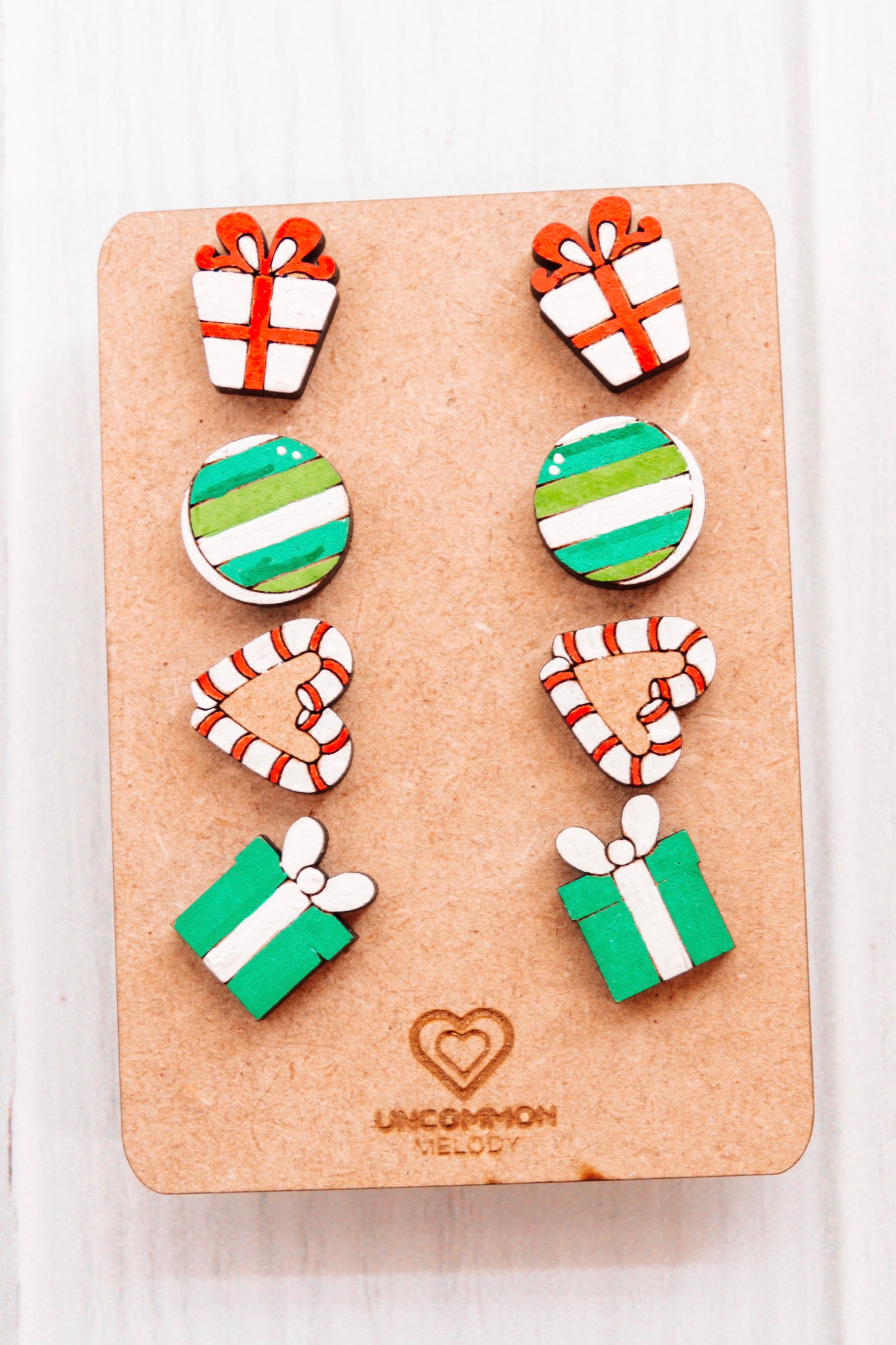 Spread festive cheer with this set of four hand-painted wooden stud earrings, each featuring a unique holiday design! This charming set includes wrapped presents, striped ornaments, candy cane hearts, and green gift boxes, all painted with bright, vibrant colors. Crafted from lightweight wood with hypoallergenic stainless steel posts, these earrings are both comfortable and durable. Perfect for adding a touch of holiday spirit to your outfits or gifting to someone special, this versatile set can be mixed and matched for endless holiday fun!