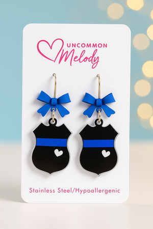Product Title: Blue Line Police Badge Earrings with Bow โ UV Printed Acrylic | Uncommon Melody