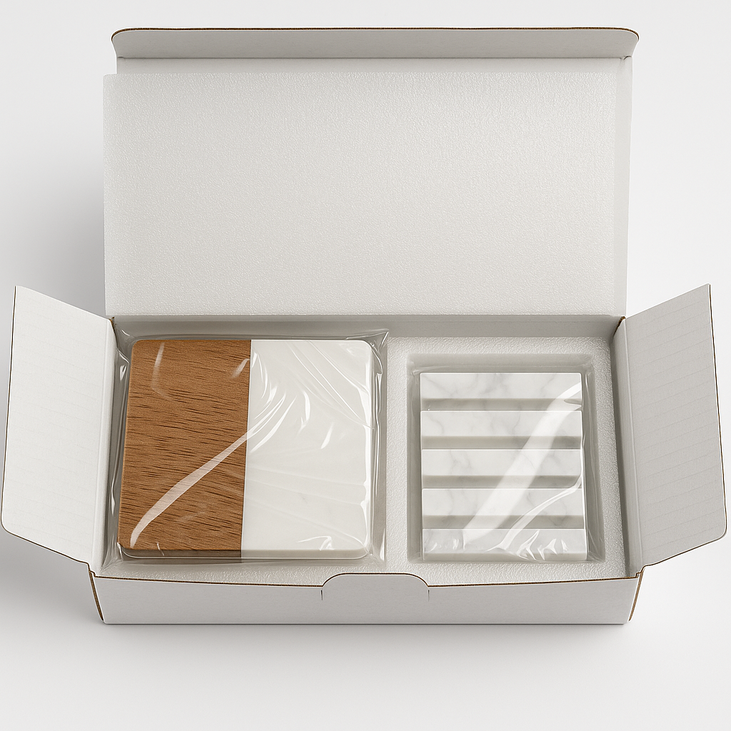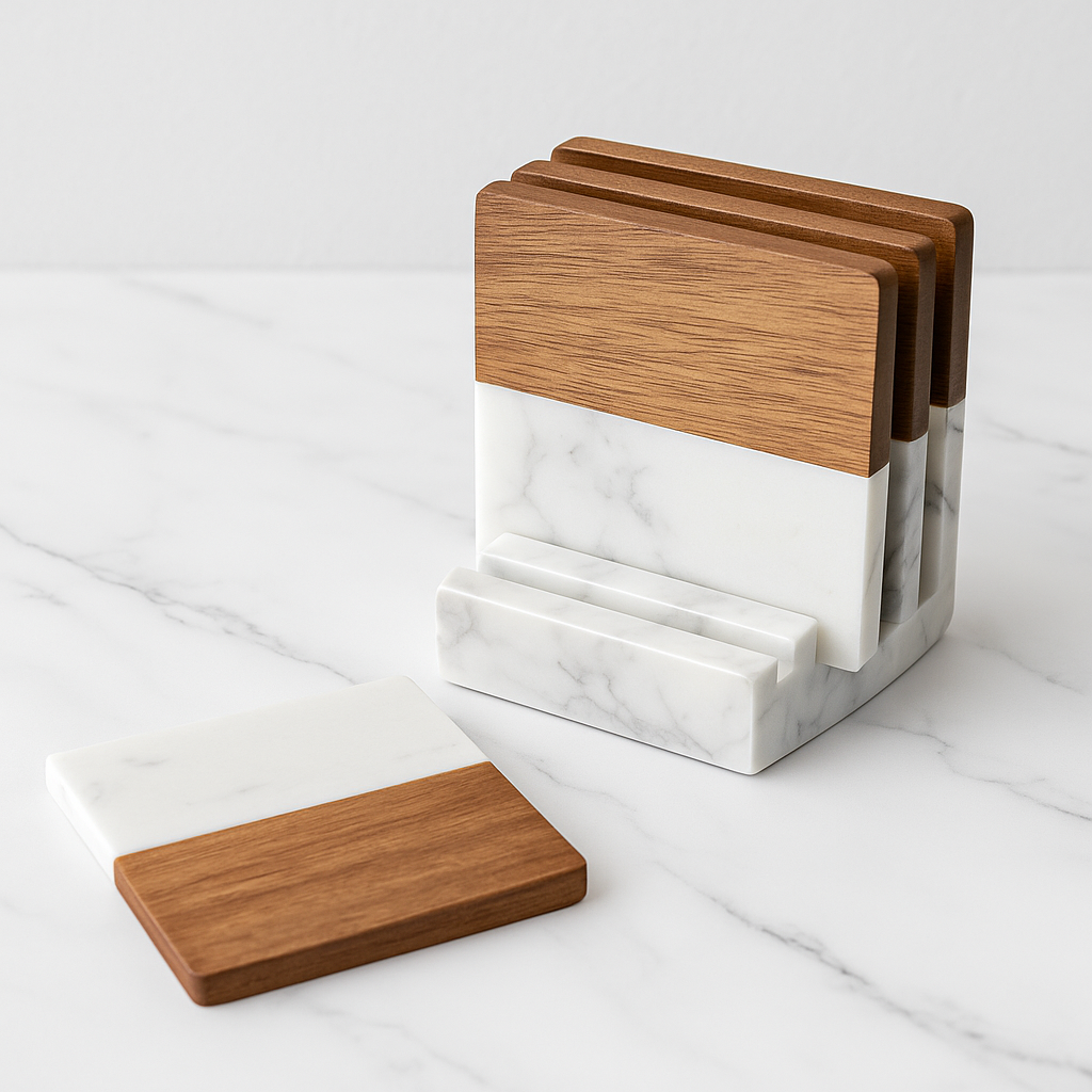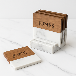 Elevate your gift-giving with our luxurious set of four custom coasters, crafted from natural acacia wood and polished white marble. Each piece is precision laser-engraved with your chosen name, logo, or message—making this the perfect gift for clients, colleagues, or loved ones who appreciate quality and personalization.