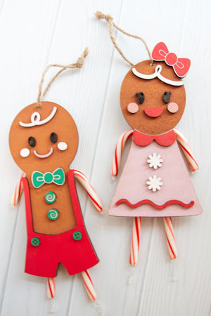 Add a touch of holiday cheer to your decorations with this charming Gingerbread Couple Ornament Set. Crafted from durable wood and meticulously hand-painted, each ornament features delightful details, bringing personality to your holiday decor. The set includes one gingerbread boy with green accents and a bow tie and one gingerbread girl in a pink dress with floral decorations. Perfect for hanging on your Christmas tree or adding to wreaths and other seasonal displays. Please note, candy canes are not included.